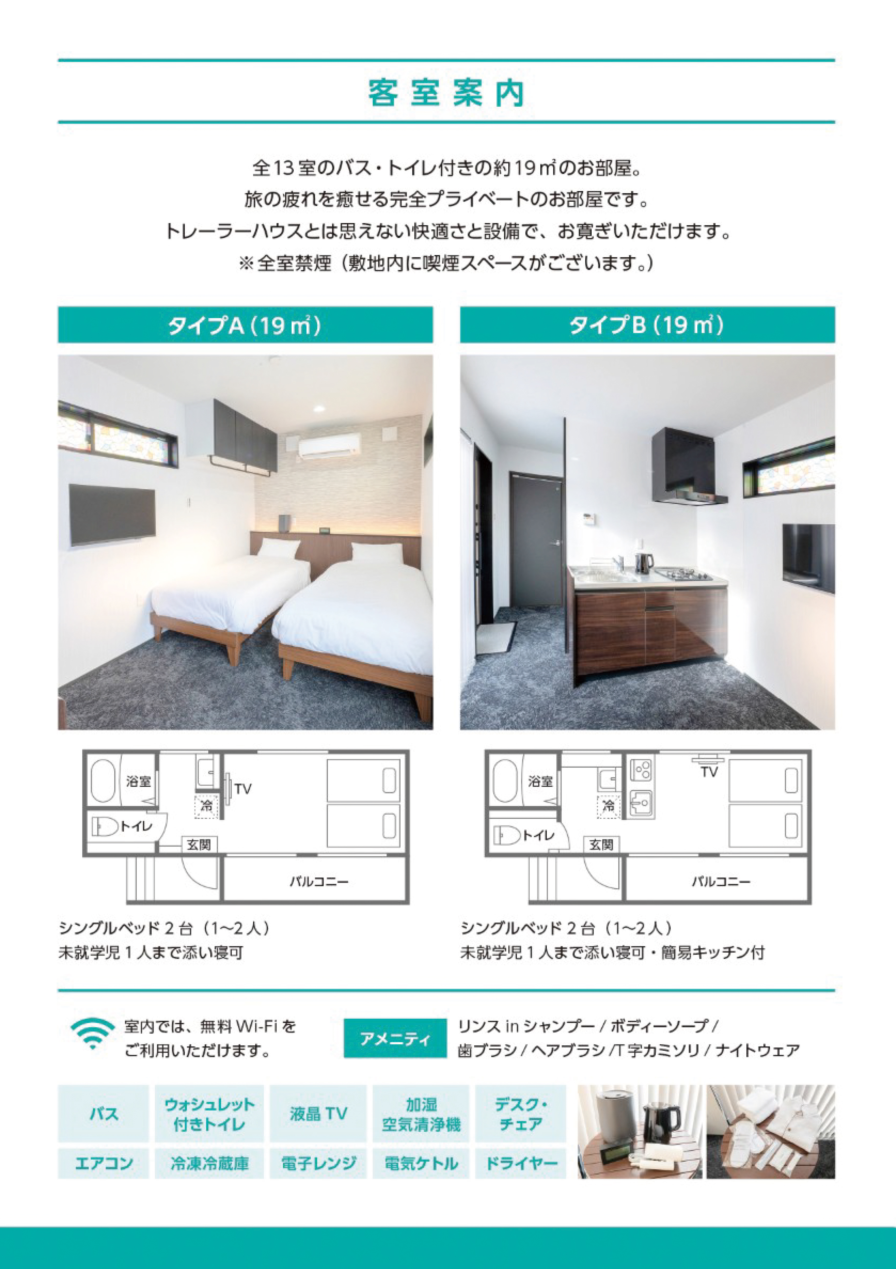 トレーラーハウスとは思えない快適さと設備でお寛ぎいただけます。